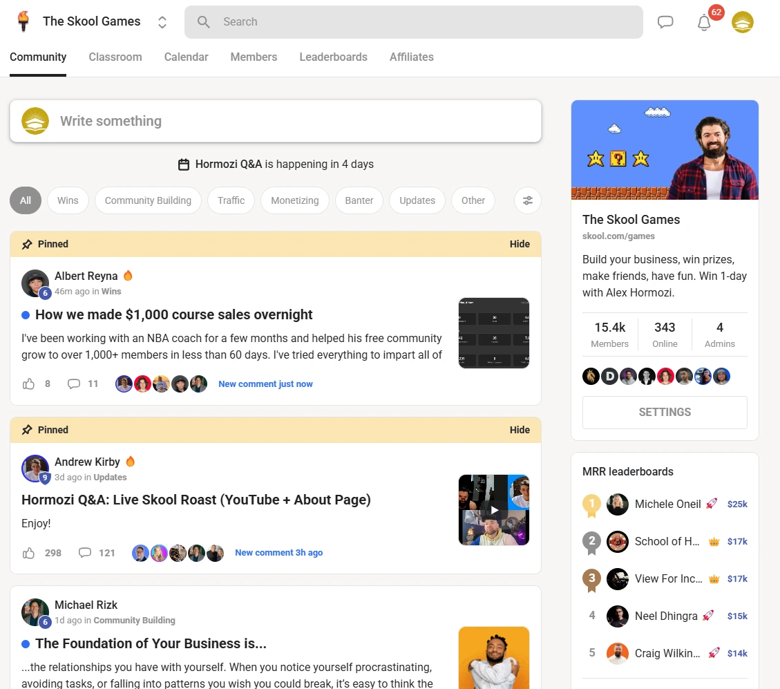Led by Alex Hormozi, Skool Games makes building an online community easy, fun, and profitable. Turn your passions or skills into a thriving business with step-by-step guidance and proven strategies.